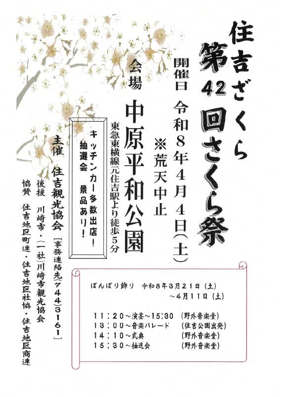 今年も「住吉ざくら さくら祭」が、4月4日(土) に中原平和公園で開催されます。