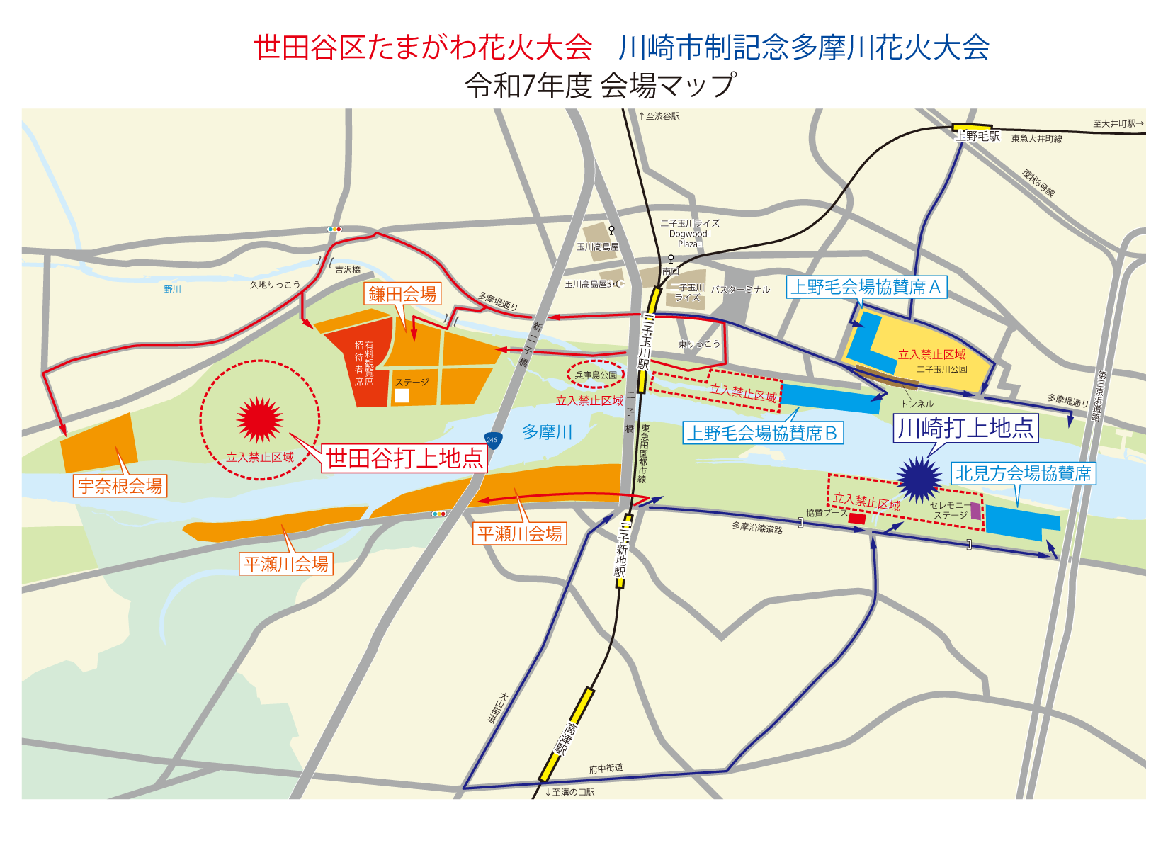 大会当日は同時刻に世田谷区の花火大会が別会場で開催され、毎年会場をお間違いになるケースが多発しております。会場マップをよくご確認いただきますようお願いいたします。